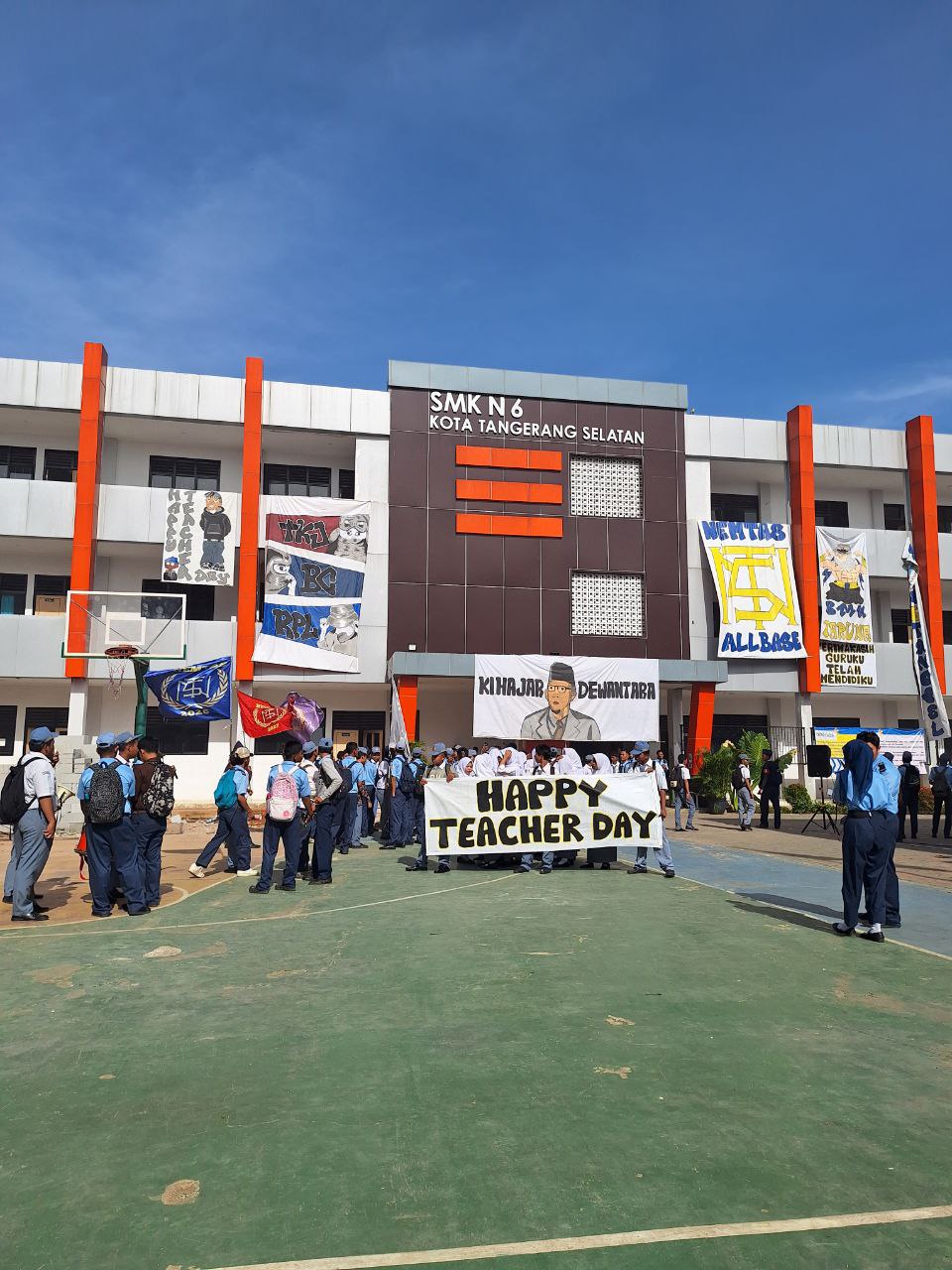 SMKN 6 Kota Tangerang Selatan menyelenggarakan upacara bendera dalam rangka memperingati Hari Guru Nasional tahun 2025. Upacara berlangsung dengan khidmat di lapangan sekolah dan diikuti oleh seluruh guru, tenaga kependidikan, serta peserta didik.
