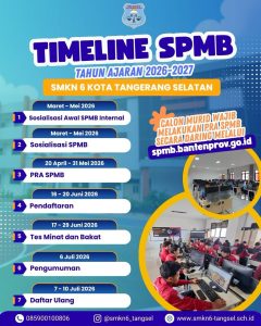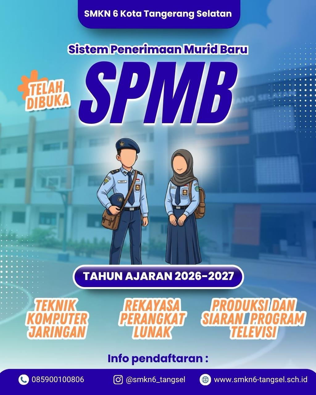 Selamat datang di laman informasi resmi SPMB SMK Negeri 6 Kota Tangerang Selatan. Berikut adalah panduan lengkap mengenai jadwal, persyaratan, dan prosedur pendaftaran untuk calon murid baru.